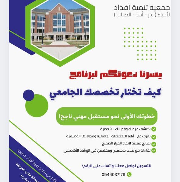 كيف تختار تخصصك الجامعي🤔محتار كيف تختار تخصصك الجامعي 🎓 إعلان هام لطلاب المرحلة الثانوية! جمعية تنمية أفذاذ تدعوكم لحضور البرنامج المميز: 🌟 “كيف ... اقرأ أكثر