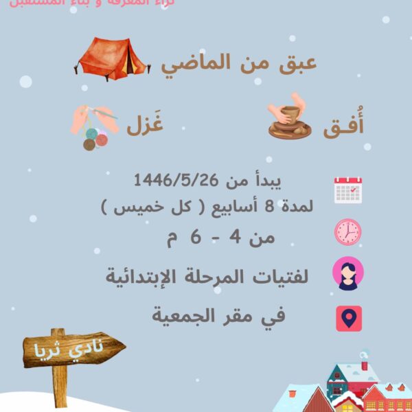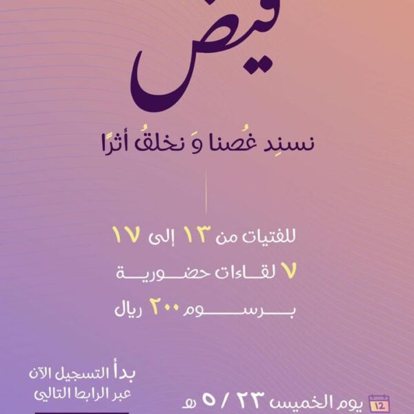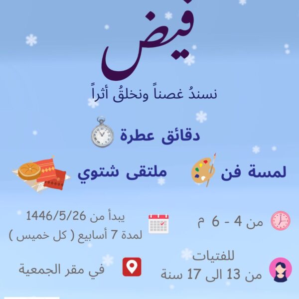 نادي فيضنادي فيض نادي فيض يقدم لقاءات حضورية اسبوعية لفتيات الفئة السنية من 13- 17 سنه ، ويقدم الورش والبرامج الابداعية ... اقرأ أكثر