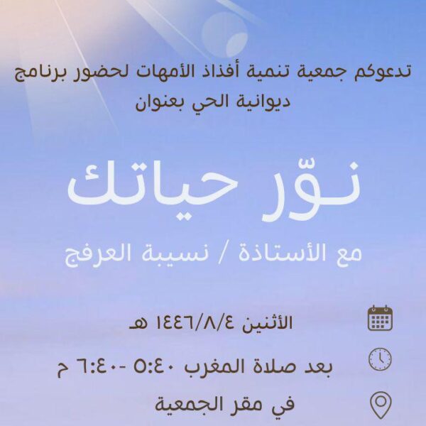 برنامج ديوانية نساء الحي ( الموسم الثاني ) لعام 1445- 1446 هـبرنامج أسبوعي يقدم لفئة الأمهات مع عدد من الأستاذات والمستشارات في العديد من المواضيع المثرية . ... اقرأ أكثر