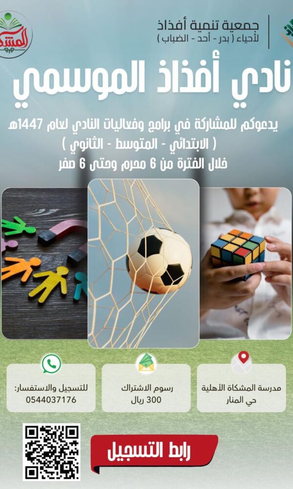 يسر جمعية تنمية أفذاذ دعوتكم للتسجيل والمشاركة في: 🎯 نادي أفذاذ الموسمي لعام 1447هـ 📚 الفئات المستهدفة: •المرحلة الابتدائية •المرحلة المتوسطة •المرحلة الثانوية 📅 ... اقرأ أكثر